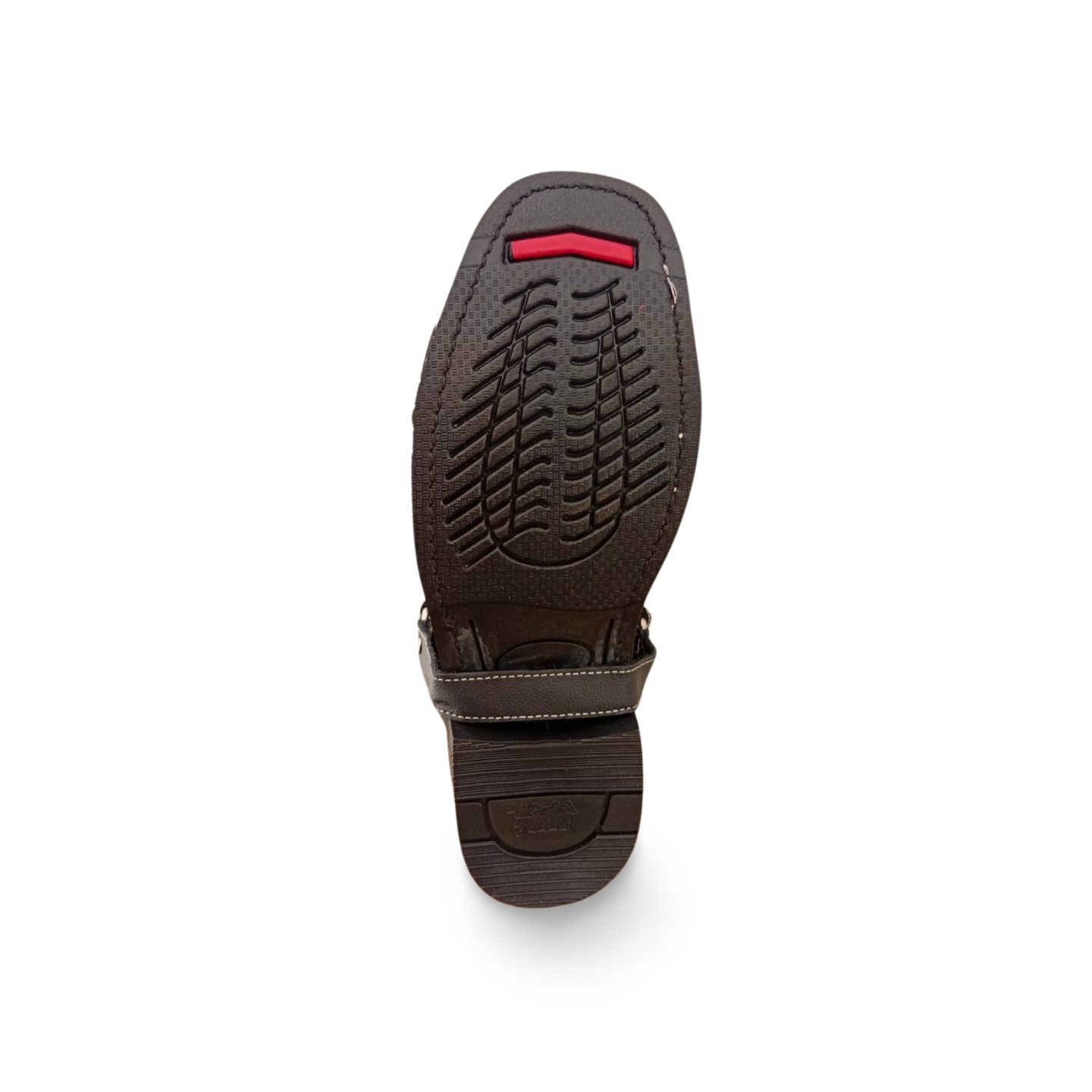 La bota tiene una punta cuadrada y un tubo alto con un corte en la parte superior. Cuenta con una correa decorativa que rodea el tobillo con una hebilla metálica. Es un calzado robusto y llamativo, perfecto para combinar durabilidad con un diseño audaz.
